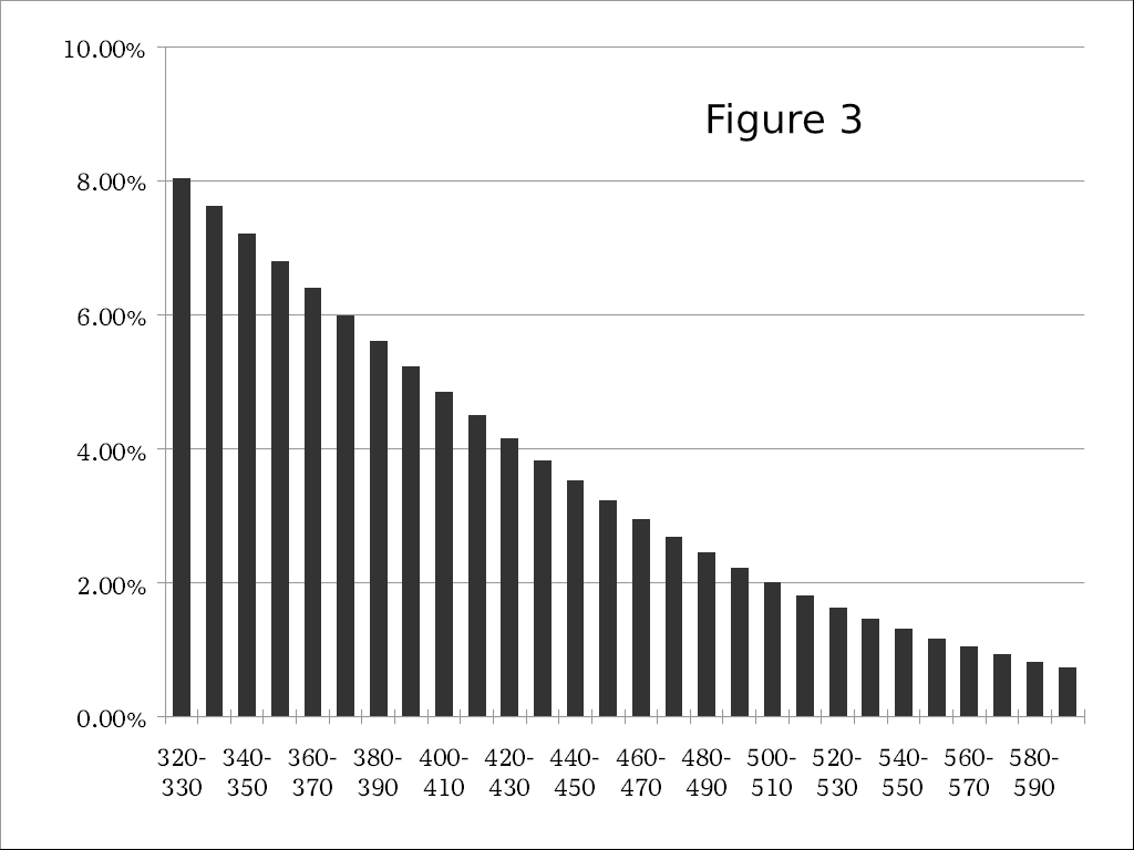 Considering the Urn example, if we grab 10 red beans in a row, then the number of red beans has been decreased, so the probability of “grabbing” a white bean has changed. The histogram must be updated. In a like way, the last big earthquake occured 320 years ago (3) so the earthquake histogram needs update, to remove bars left of 320 years (which did not occur) and to increase the bars to the right to show100% certainty that an earthquake will eventually occur. The updated histogram is Figure 3 below.